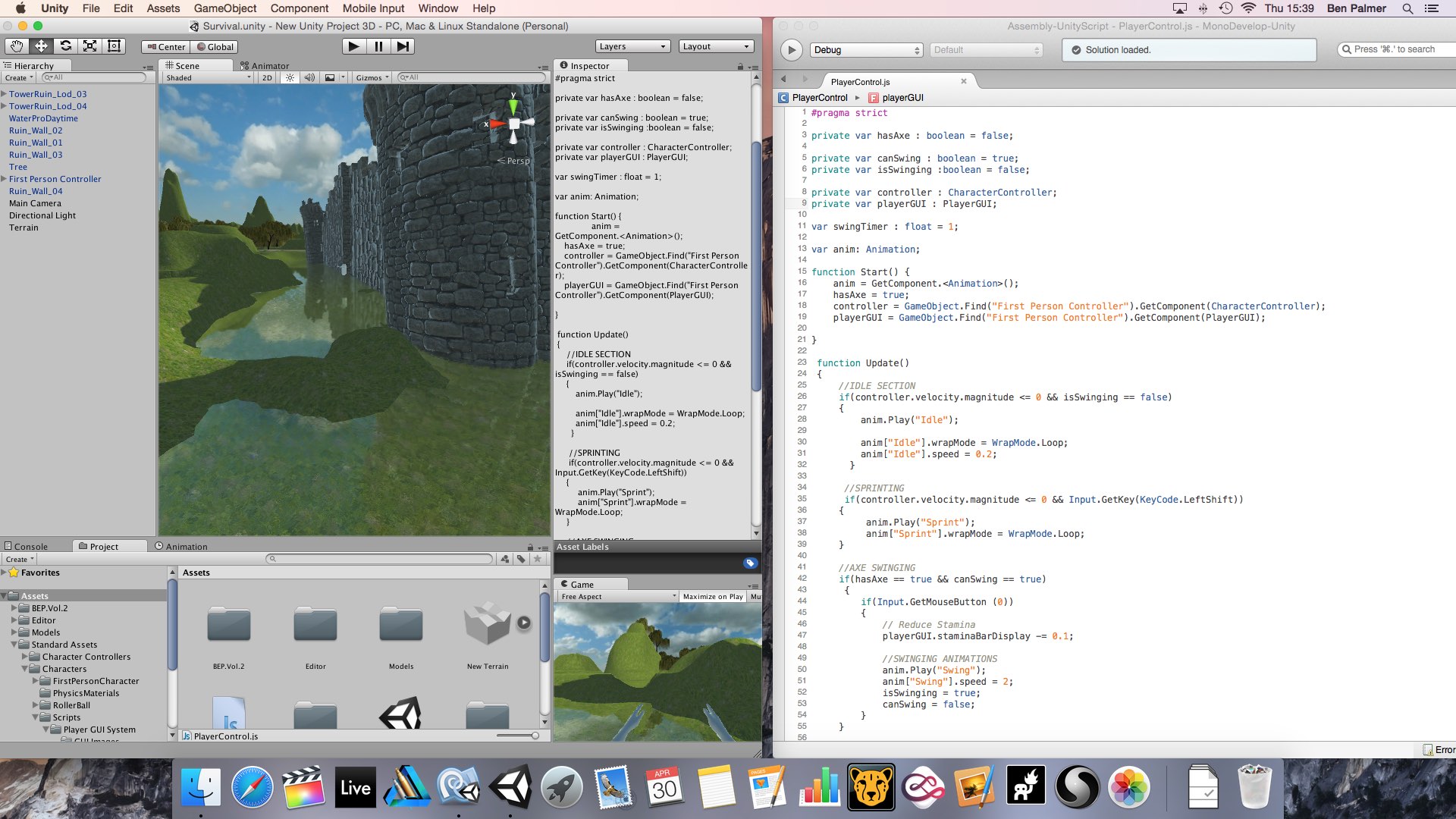 After exploring Unity3D’s 2D animation tools and level design in his Greek Game, Ben decided to dive headlong into coding his own survival game using a Youtube Tutorial Series as reference.