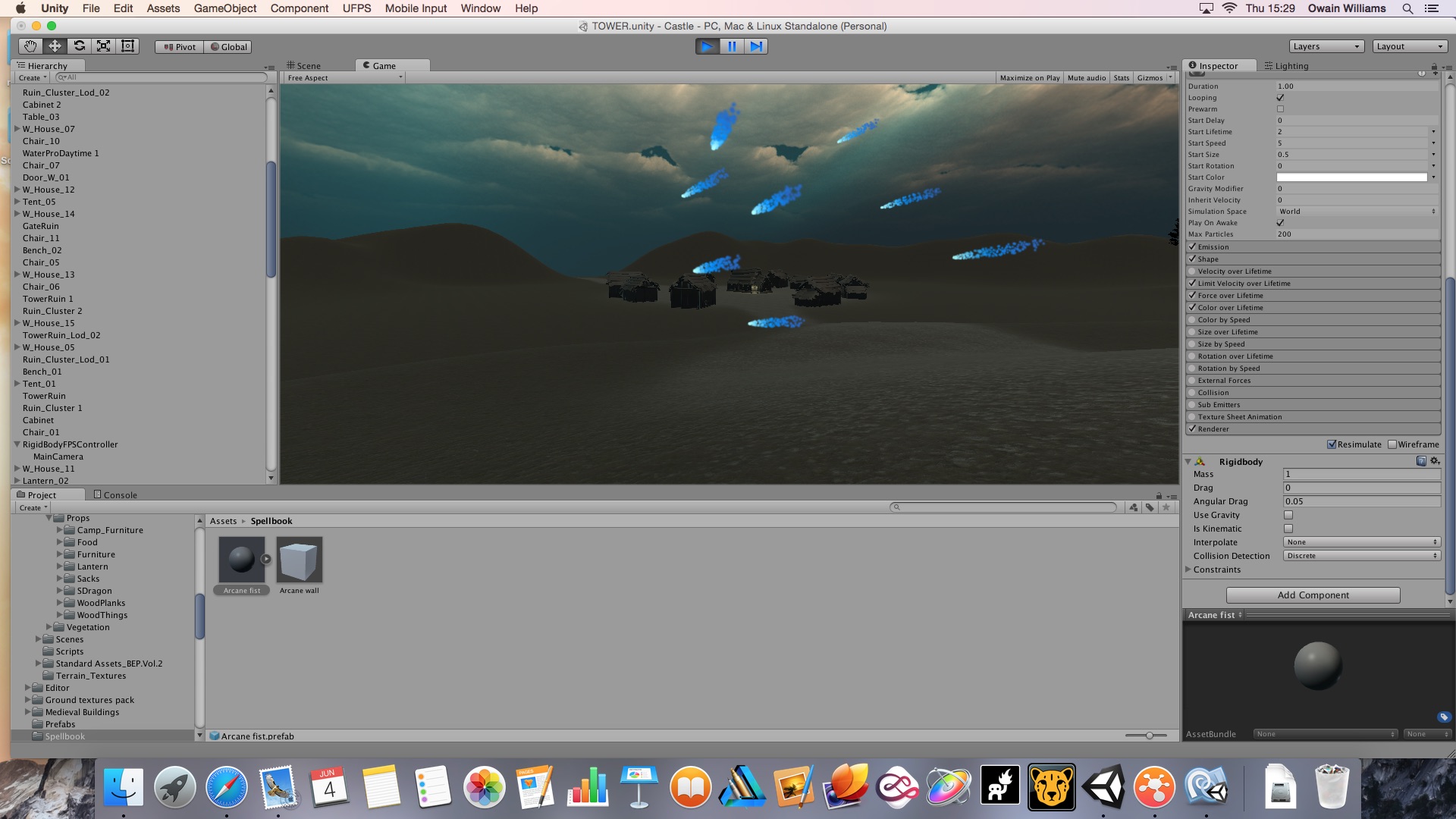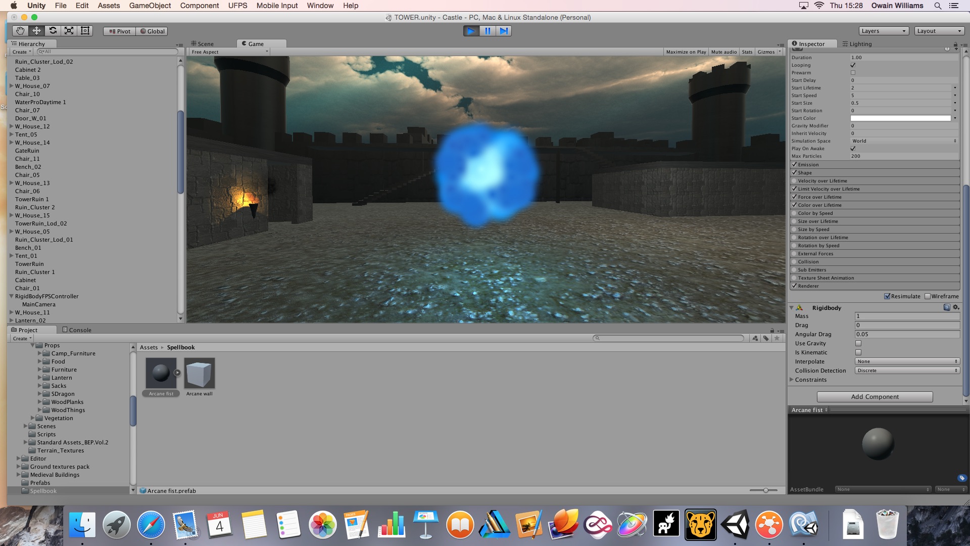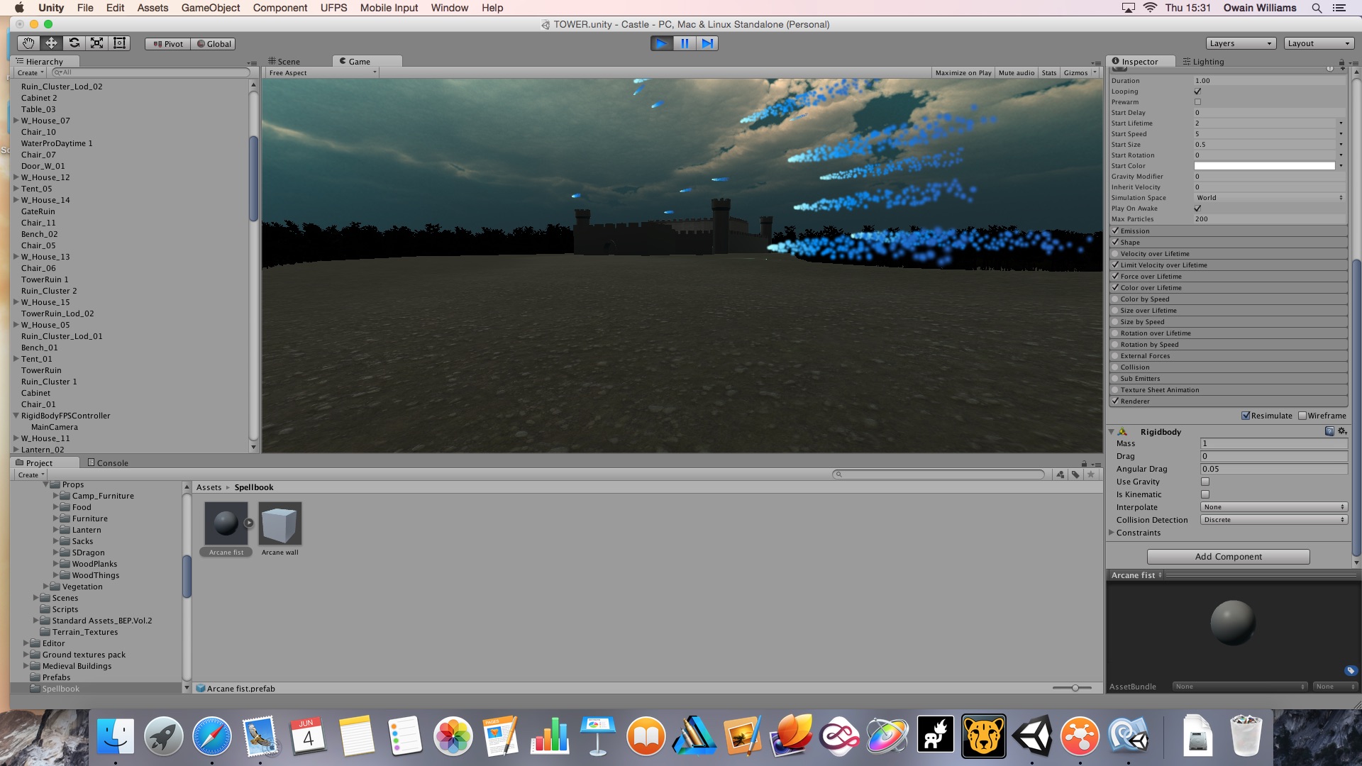 Today I played around with particle effects in a different scene to try to create possible spell effects, I created a blue fireball, a burst of flame, a vortex of blue fire, a wall of blue fire and a shower of transparent blue stuff. I then quickly created an alternative level for no real reason then went back to the original level then added a ball of blue fire so I can add light to it. I then used some programming to allow the player character to shoot balls of blue fire in the original level by clicking. I then became an evil wizard and abused this power by attacking the village and the castle with it.