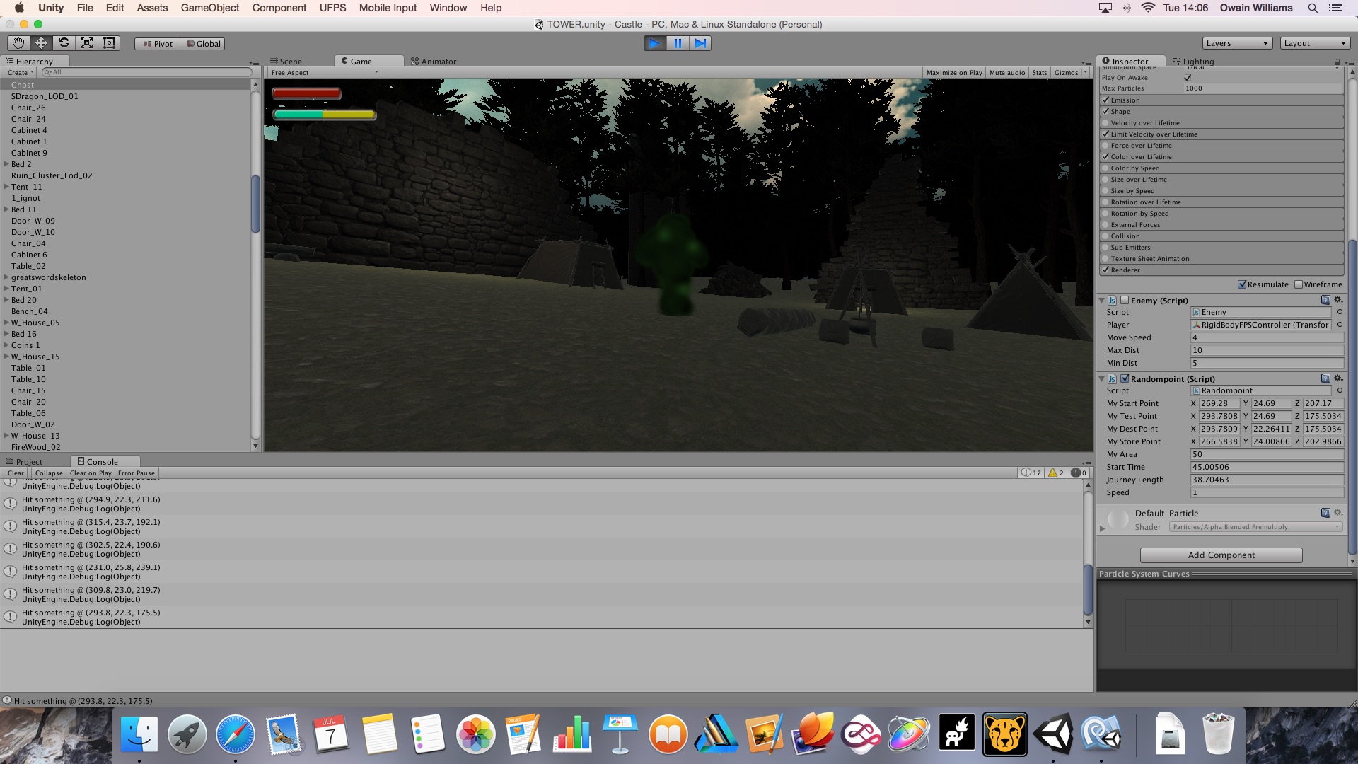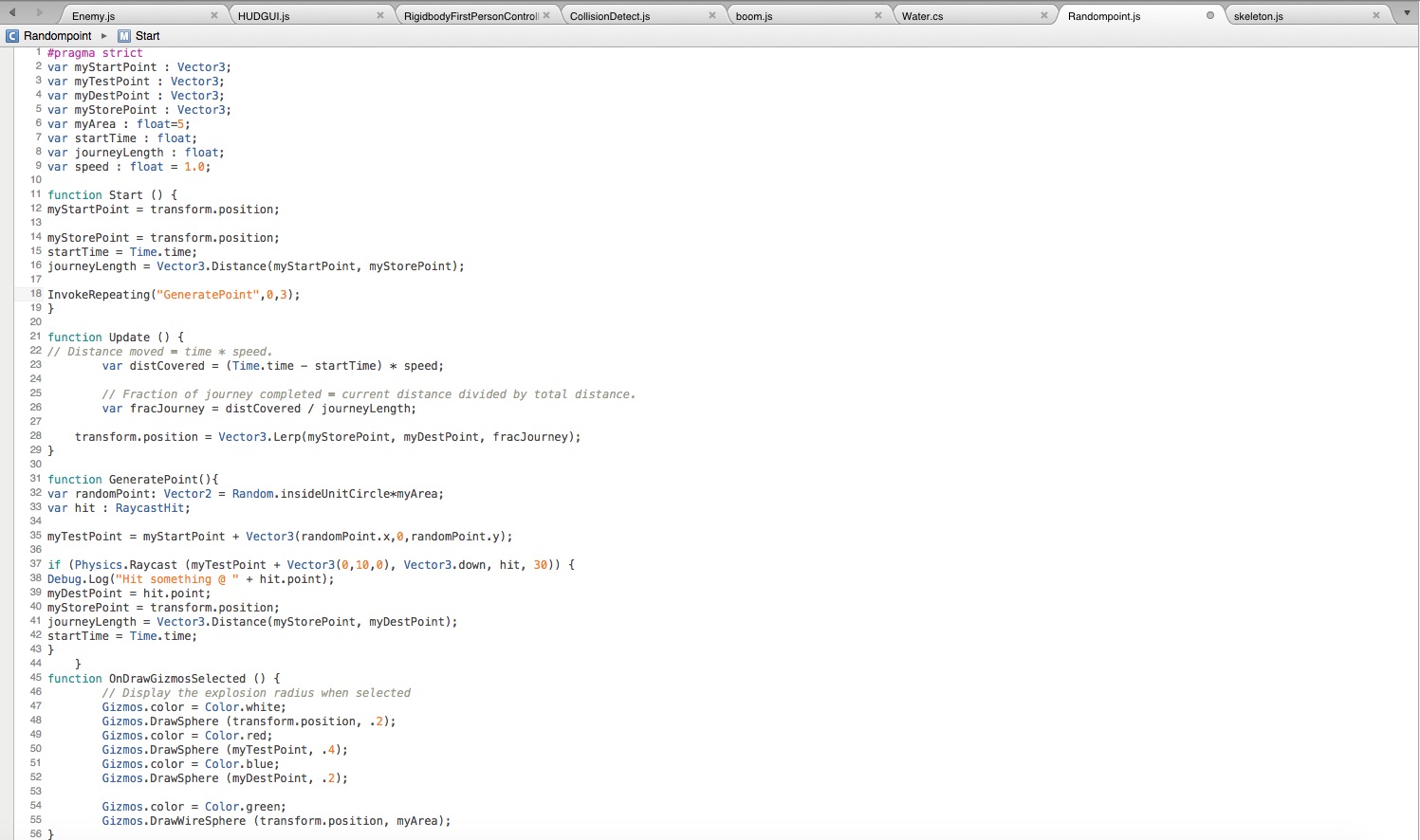 Today I went back to the ghost to see if I could get it to wonder about a certain area by following a point that is randomly generated every few seconds. I used a raycast to make sure this point is always above the ground. If I can combine this code with the code that causes the ghost to follow the player around but perhaps tweak the code so the ghost only starts to follow the player when the player gets too close then I could try to implement some kind of combat system that lets the ghost throw some spells around like I let the player do in an earlier session. I then added doors to all of the other buildings in the village and gave the buildings mesh colliders. I then went to the camp in the ruins in the forest and gave everything there mesh colliders as well, so the player can’t simply walk through them like a ghost.