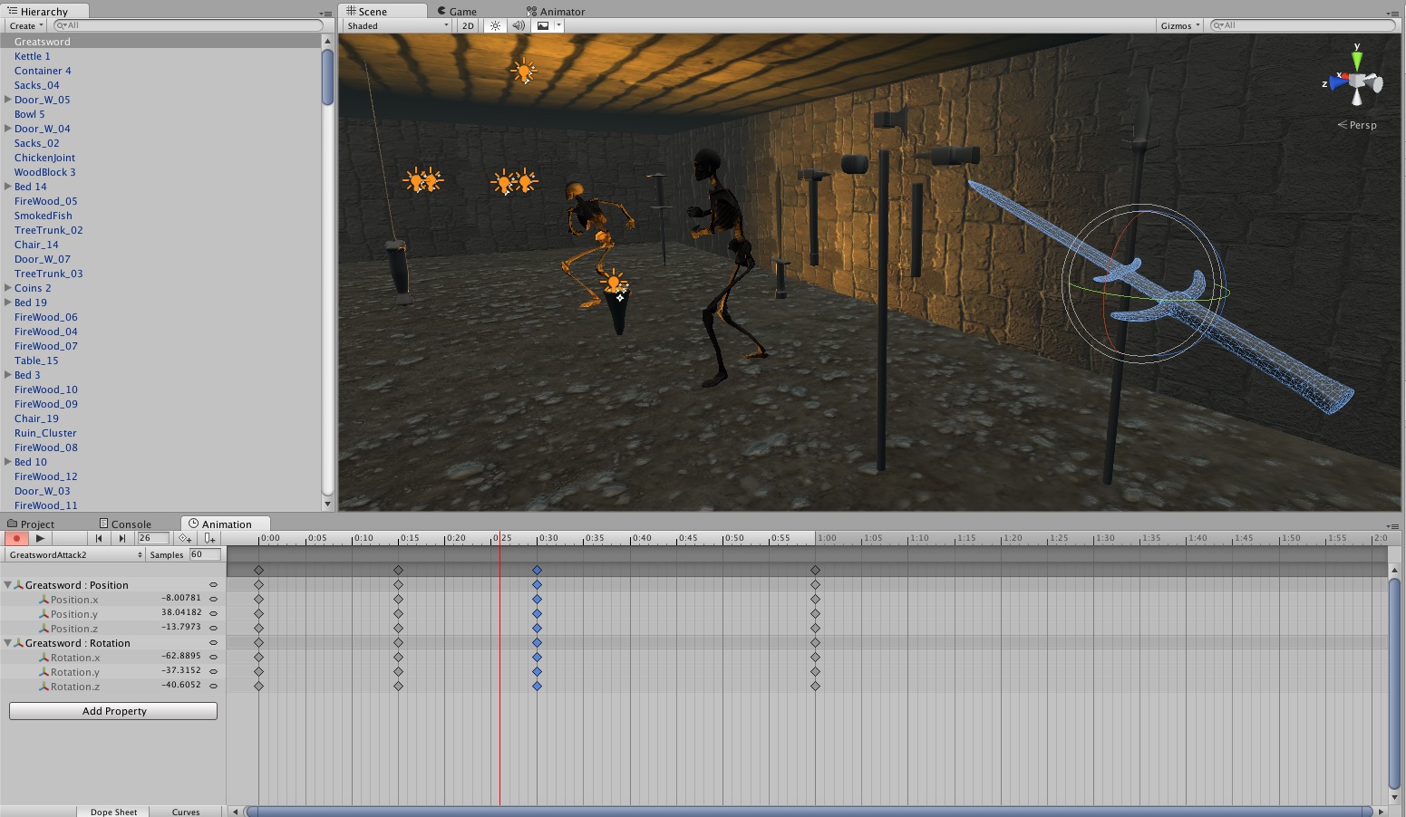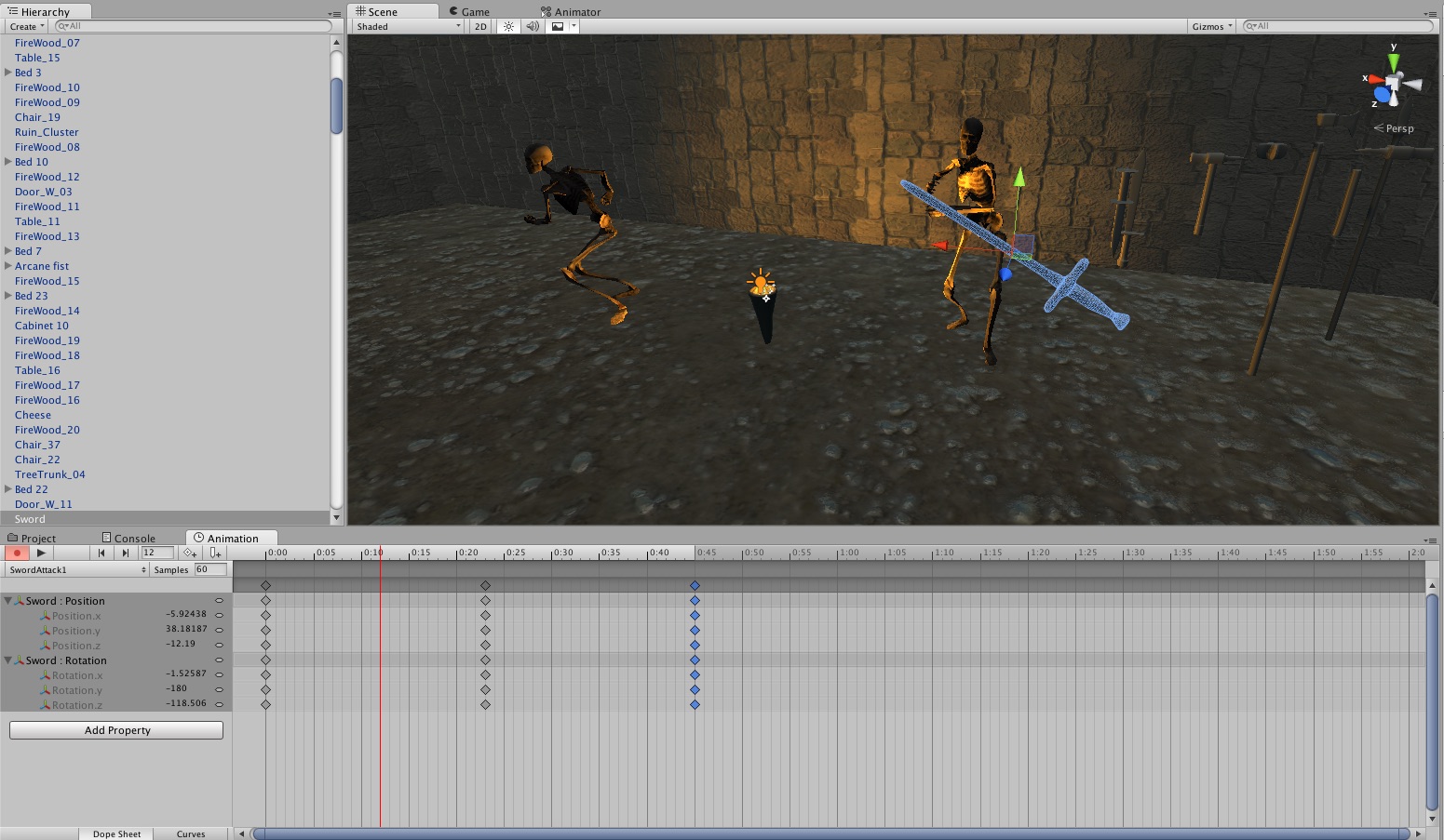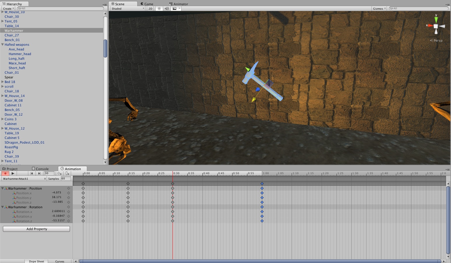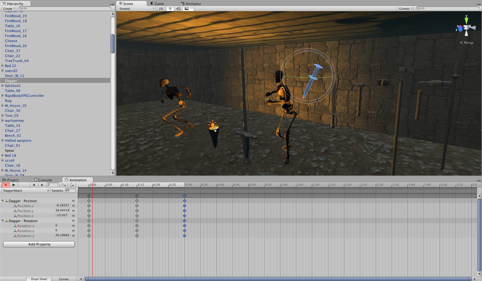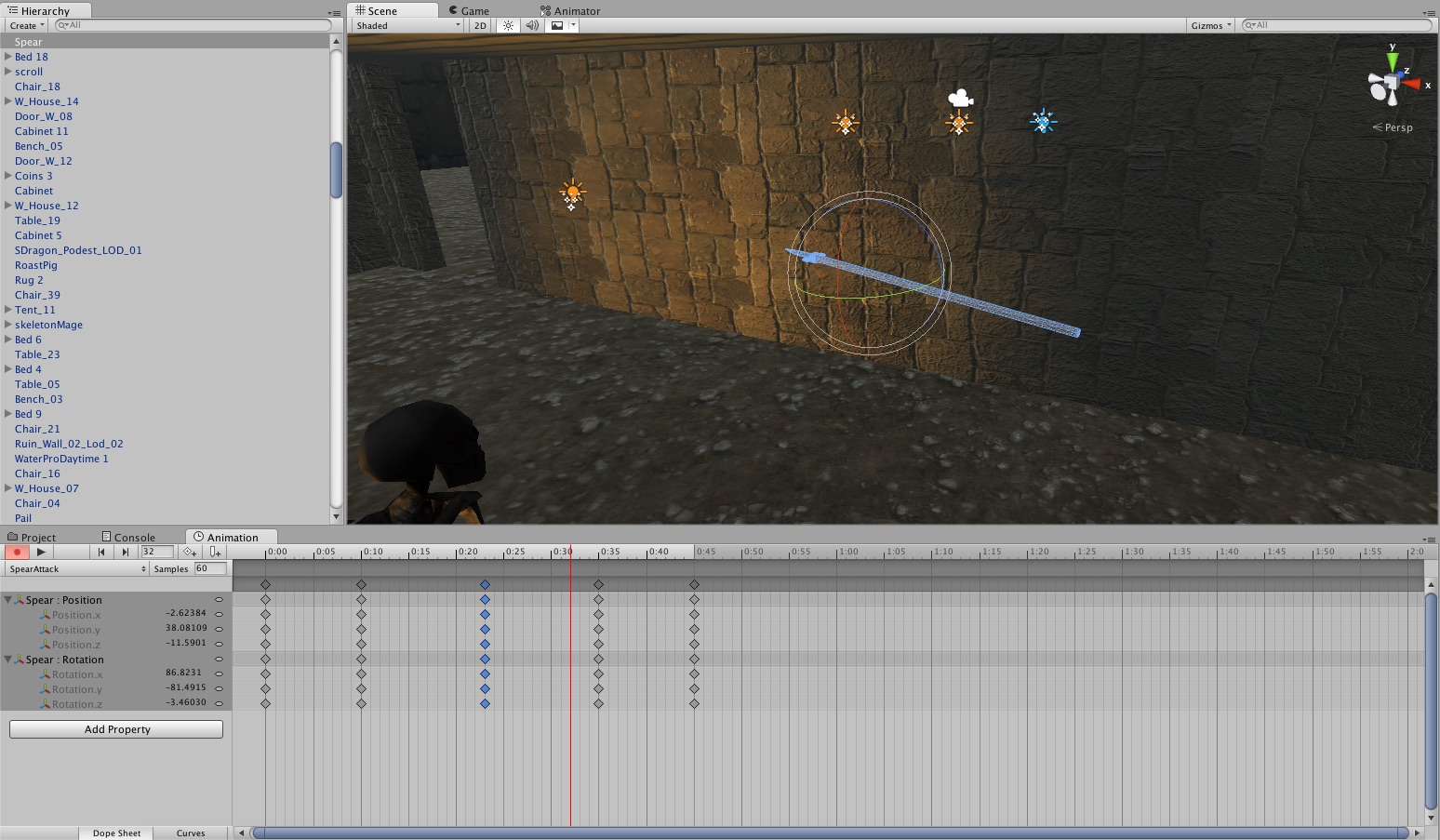 Today I decided to do more decorating at the village. Specifically I decided to fill the empty sheds with stuff, one shed was devoted to wood and the other was devoted to basically anything else. When that was done I decided to add the weapons I made early in the project into the scene so I could start making attack animations for them. Some of them turned out looking a little awkward but this was a first attempt. I do aim to give all the weapons multiple attack animations that can be selected at random every time the wielder attacks. However I struggle to see how this could be possible with the spear.