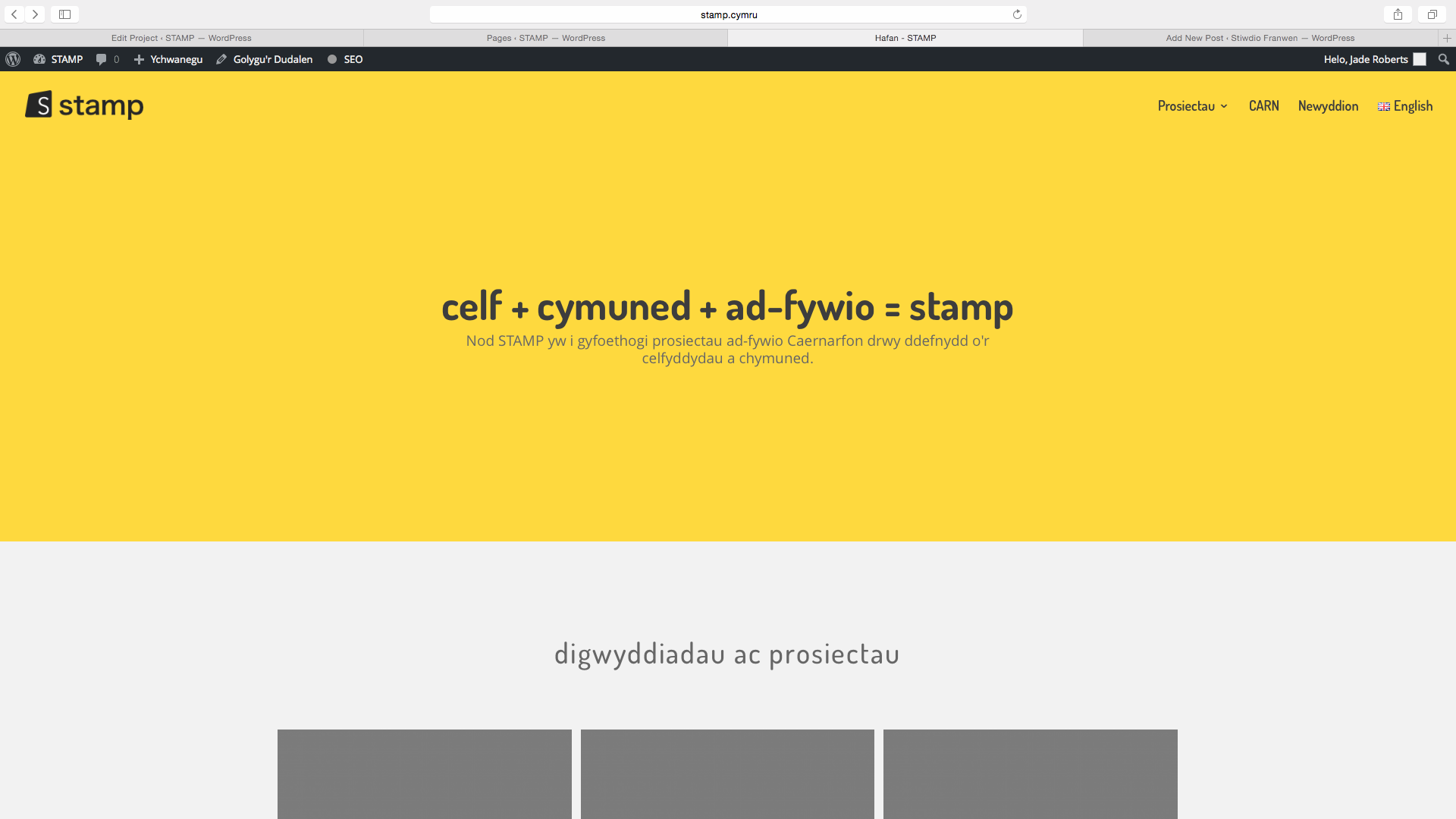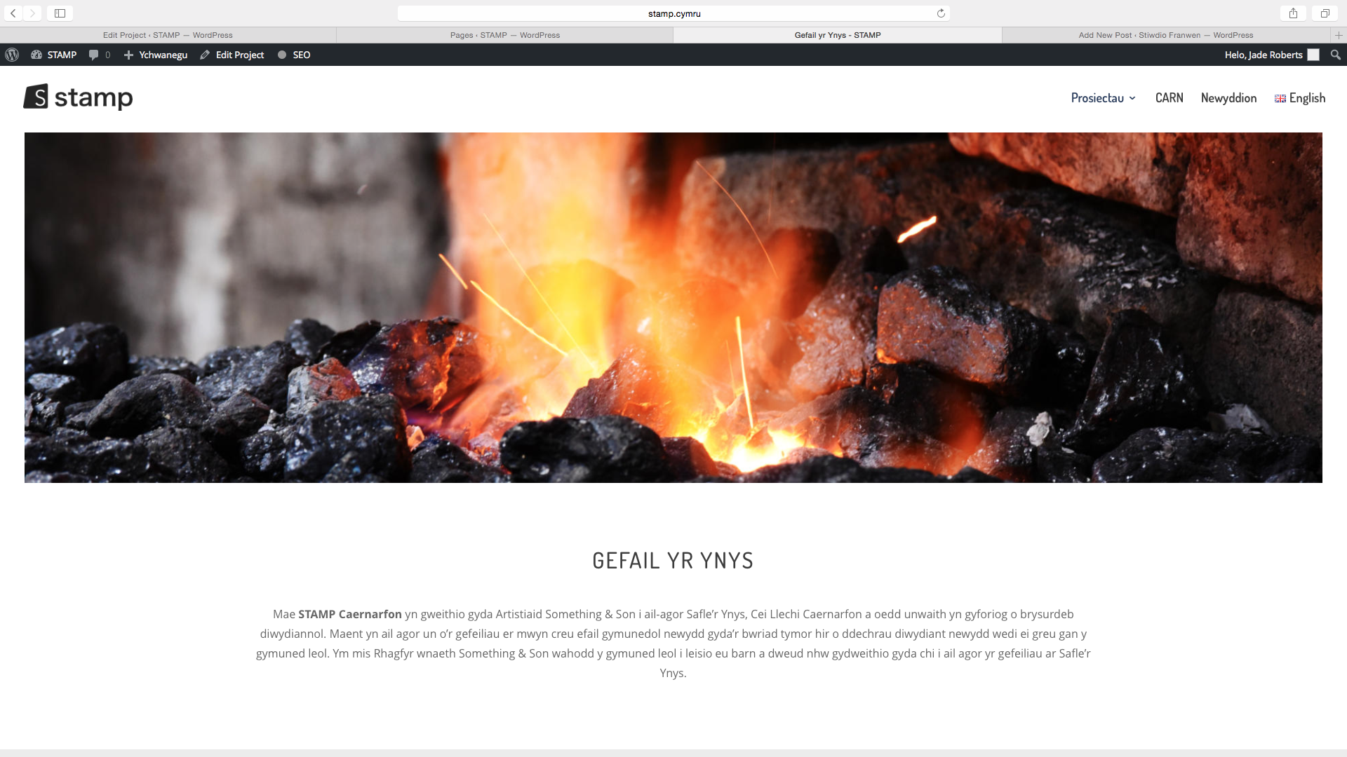 On the third day (today!) we chose a primary colour and decided it worked best throughout the website. We also got done finishing the homepage and the project page and put in some pictures which Dani and Rob went out to shoot yesterday. Later in the afternoon we had Ceri who is running the STAMP project come in to view what we had built so far and to get a final conclusion. Good news, she liked it, diolch Ceri!